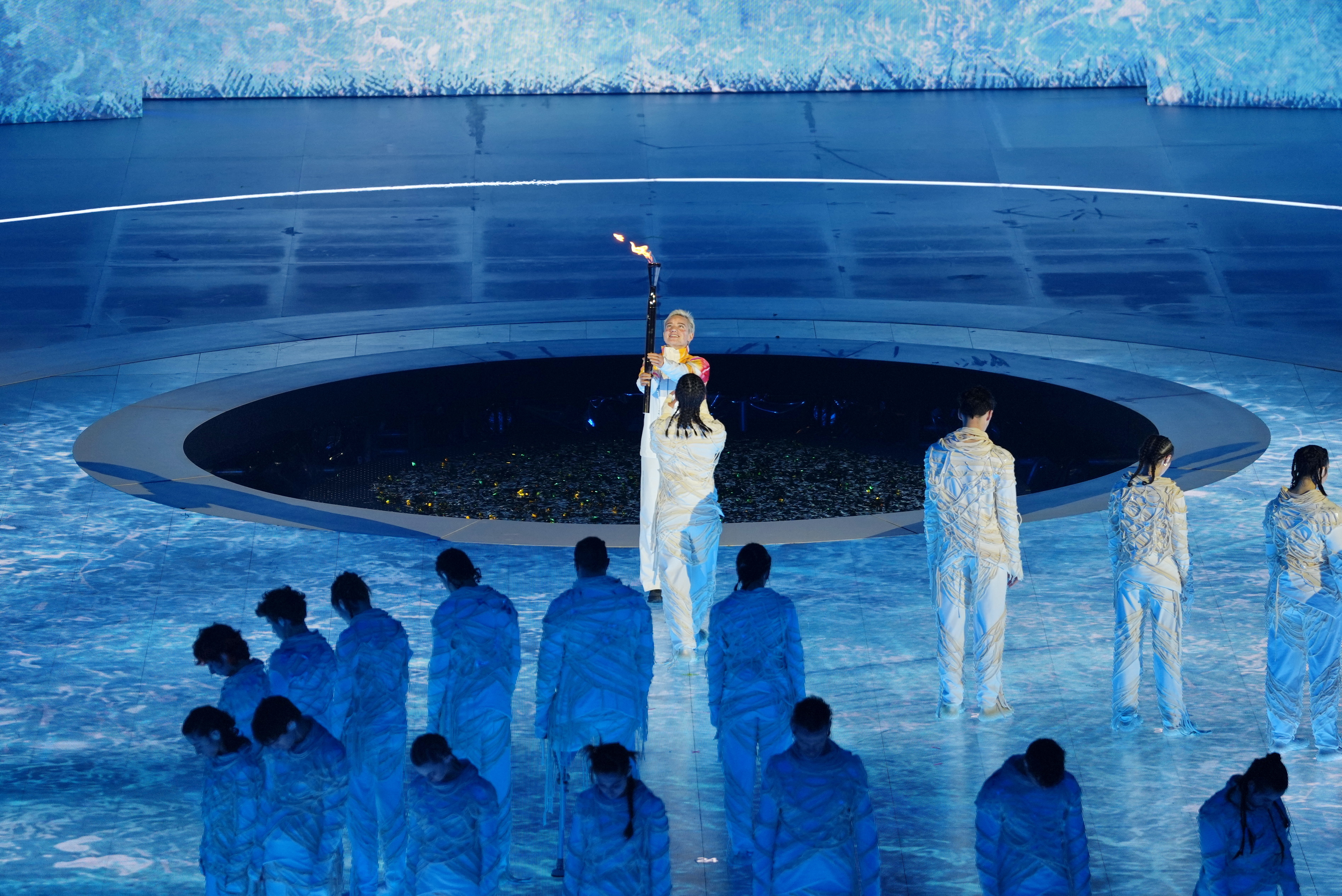 3月6日,火把手贝贝·维奥(上)手握火把在开幕式上。新华社记者 牟宇 摄