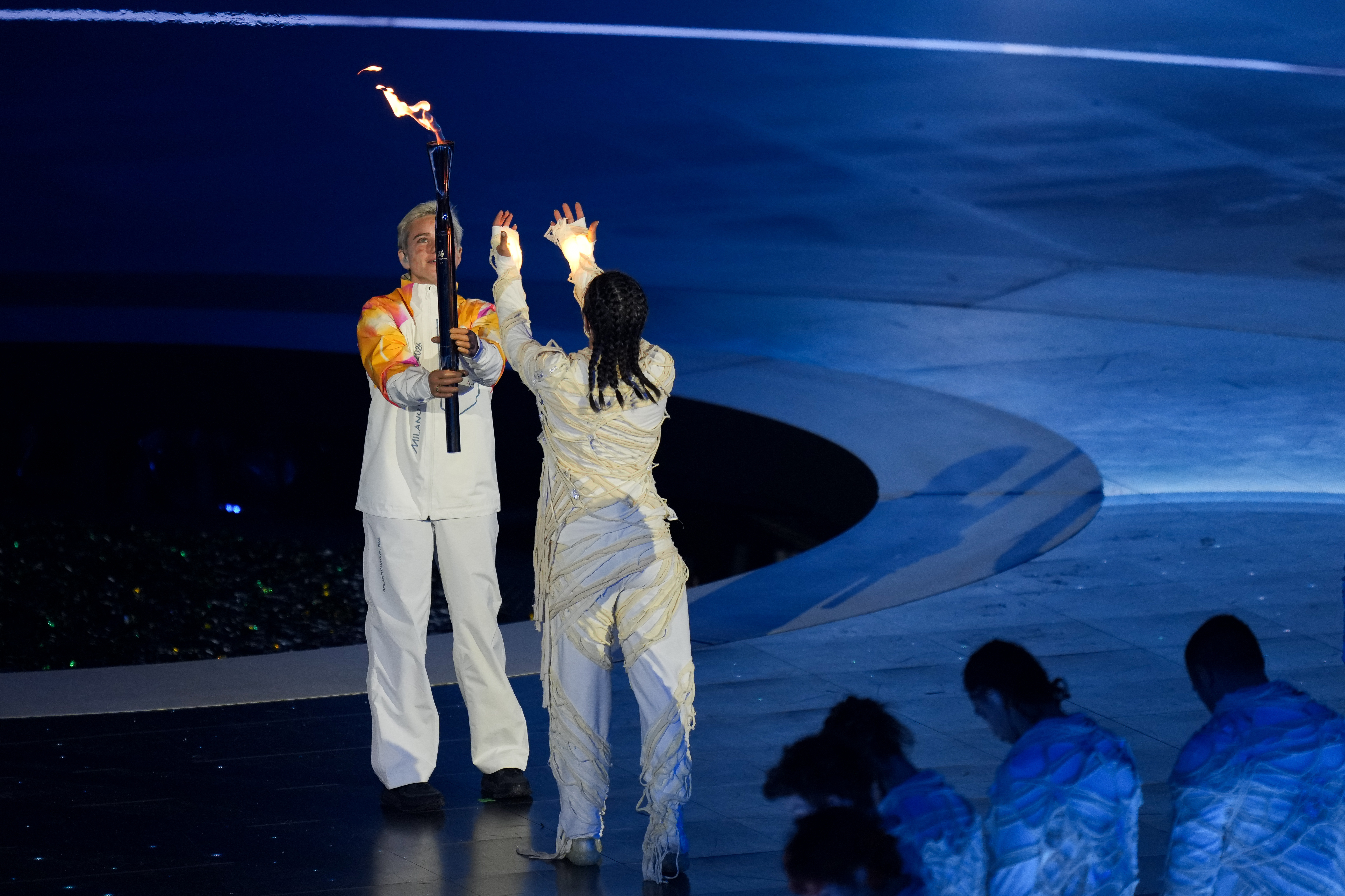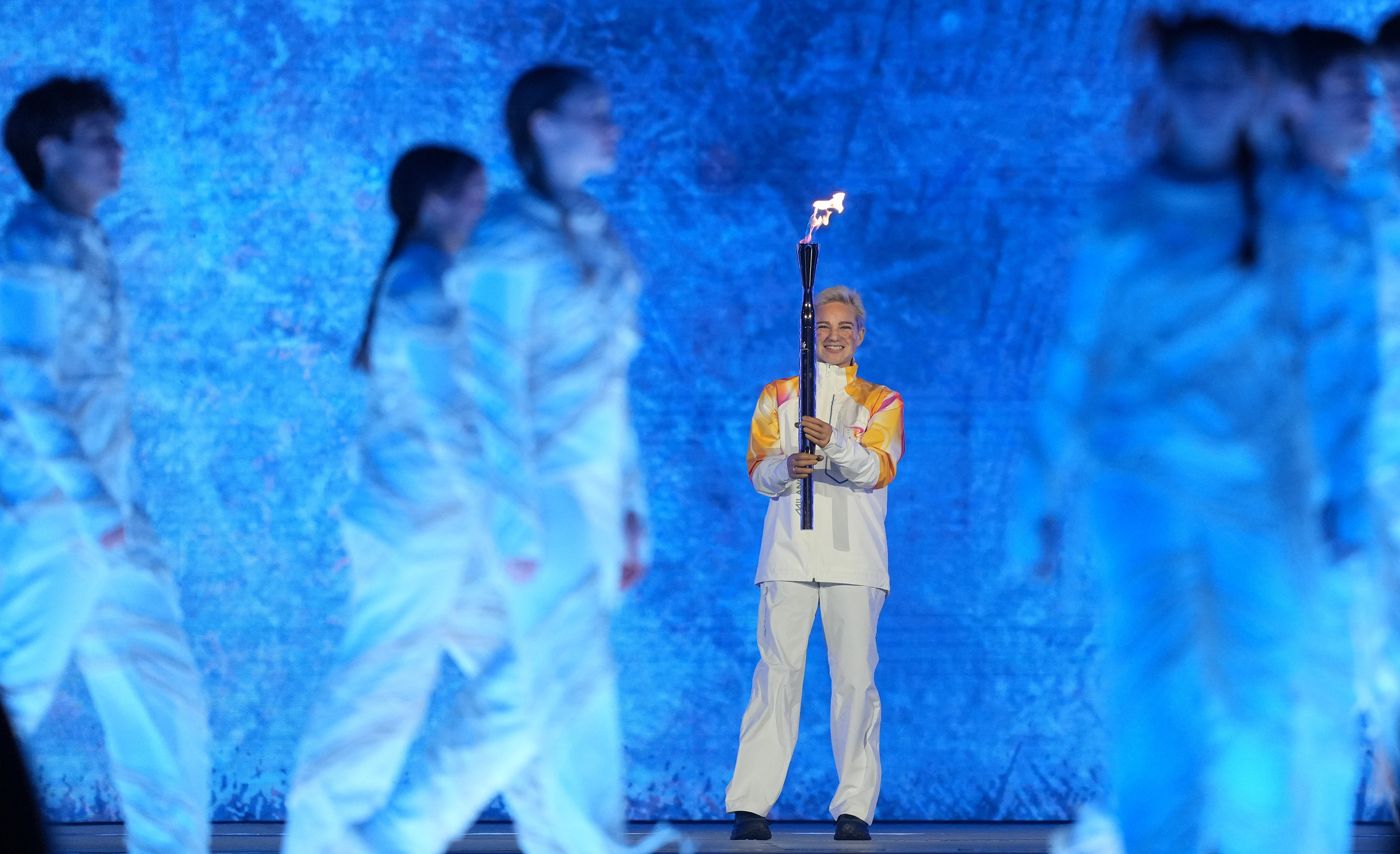 3月6日,火把手贝贝·维奥(左)手握火把在开幕式上。新华社记者 连漪 摄