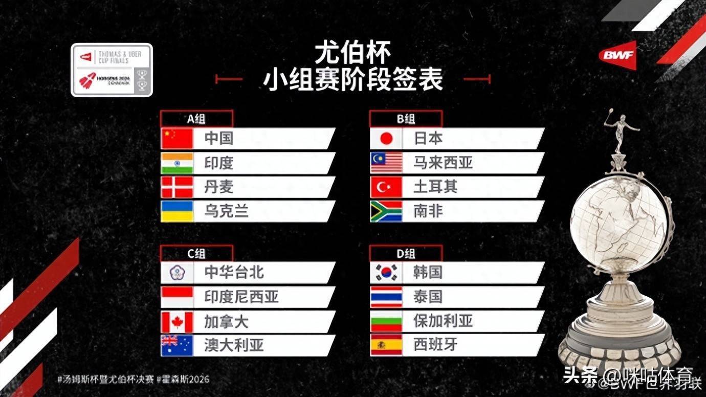 尤伯杯小组赛签表出炉A组:中国,印度,丹麦,乌克兰B组:日本,马来西亚,土耳其,南非C组:中华台北,印度尼西亚,加拿大,澳大利亚D组:韩国,泰国,保加利亚,西班牙